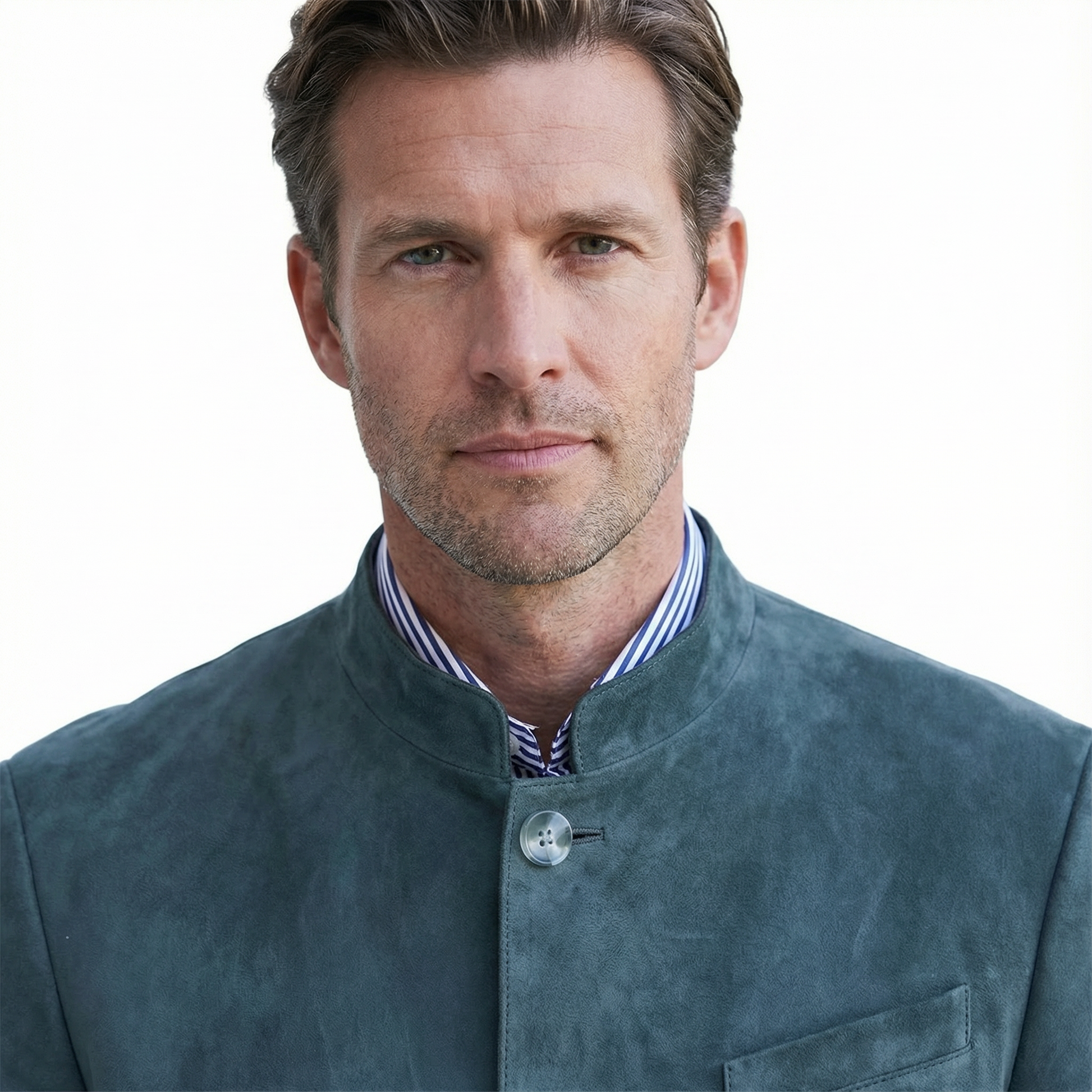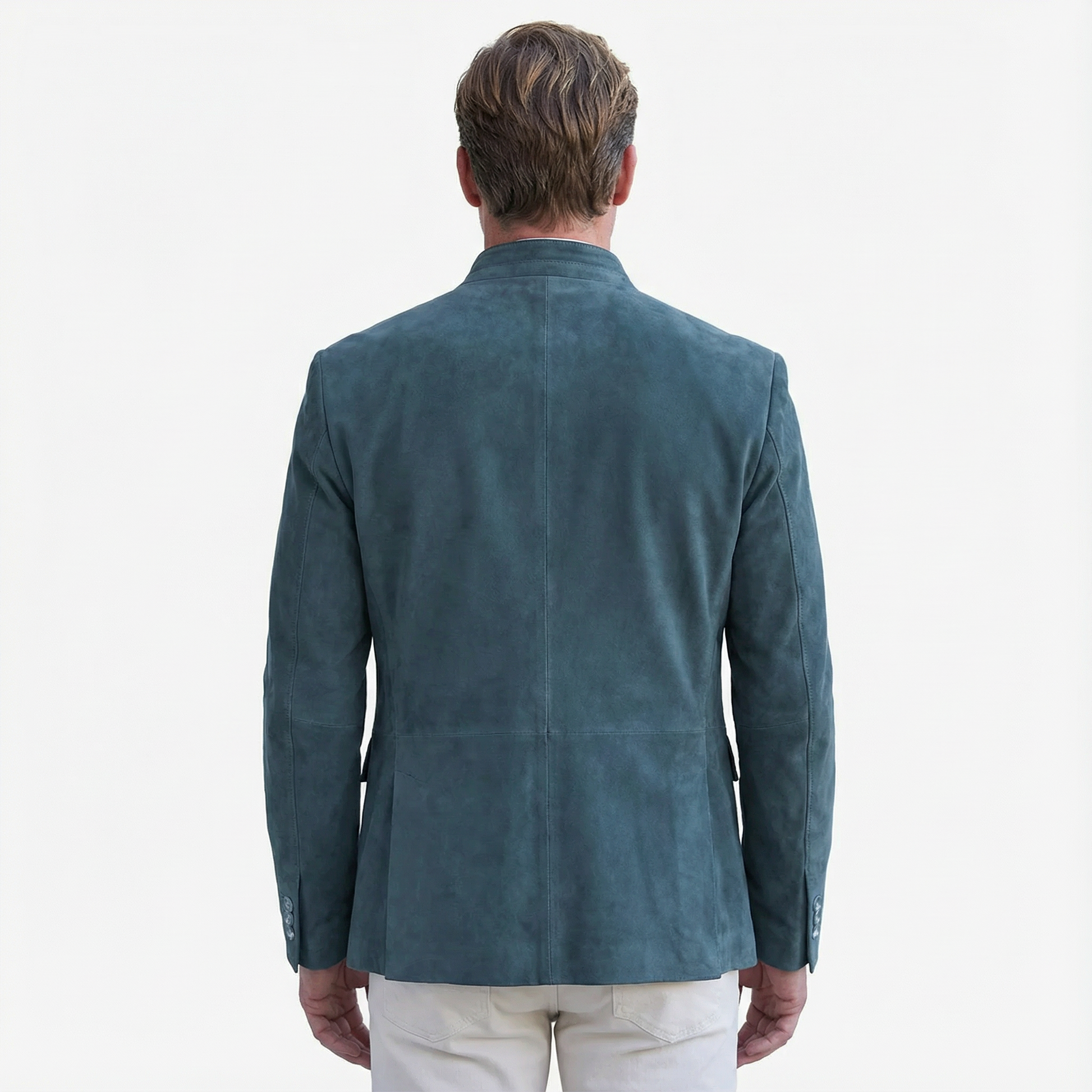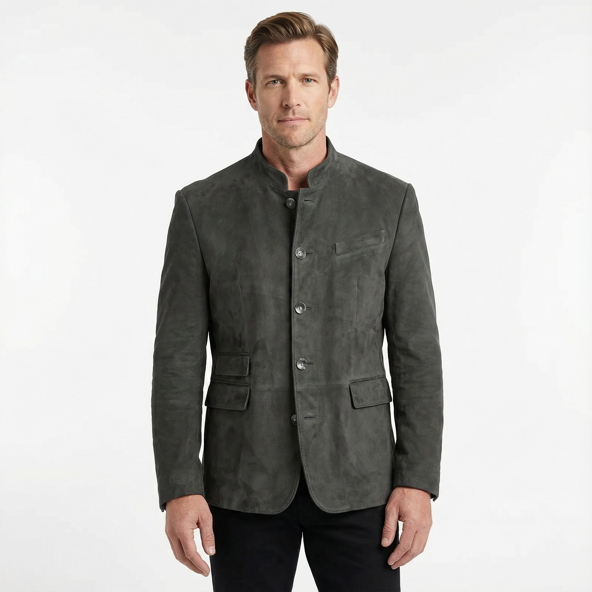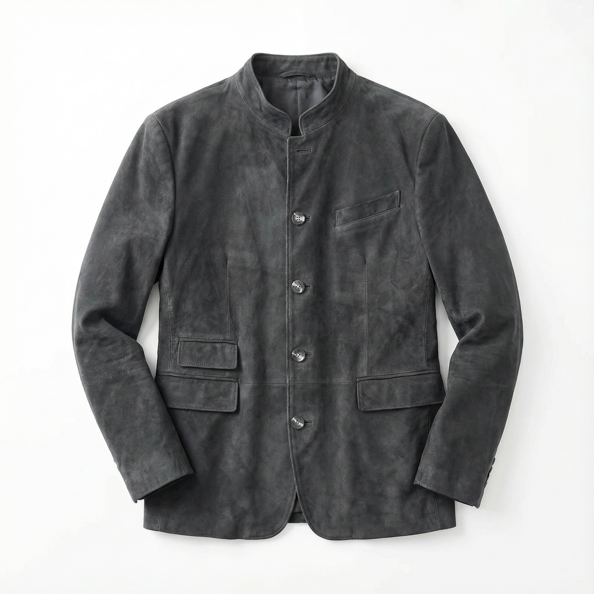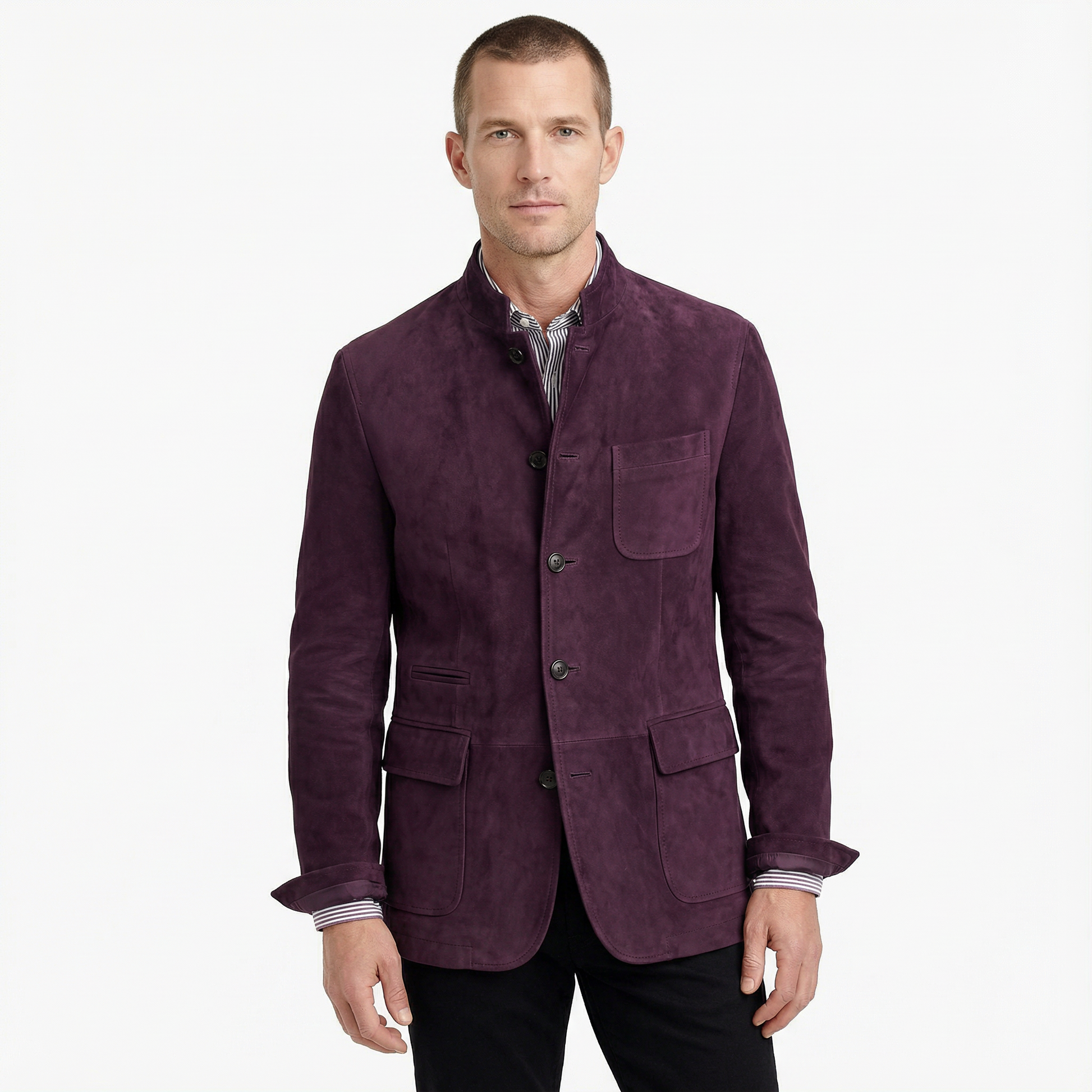This blazer features a sharp, straight shoulder line and a stand-up collar for a confident, contemporary silhouette. The button closure and multiple flap pockets add a functional yet refined touch. Sleeves and torso are streamlined for a clean, effortless fit without constriction. A commanding piece that conveys authority and presence without appearing traditional.