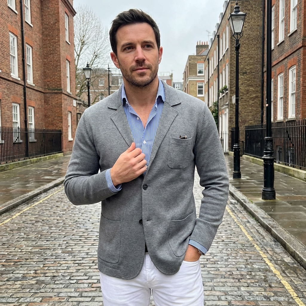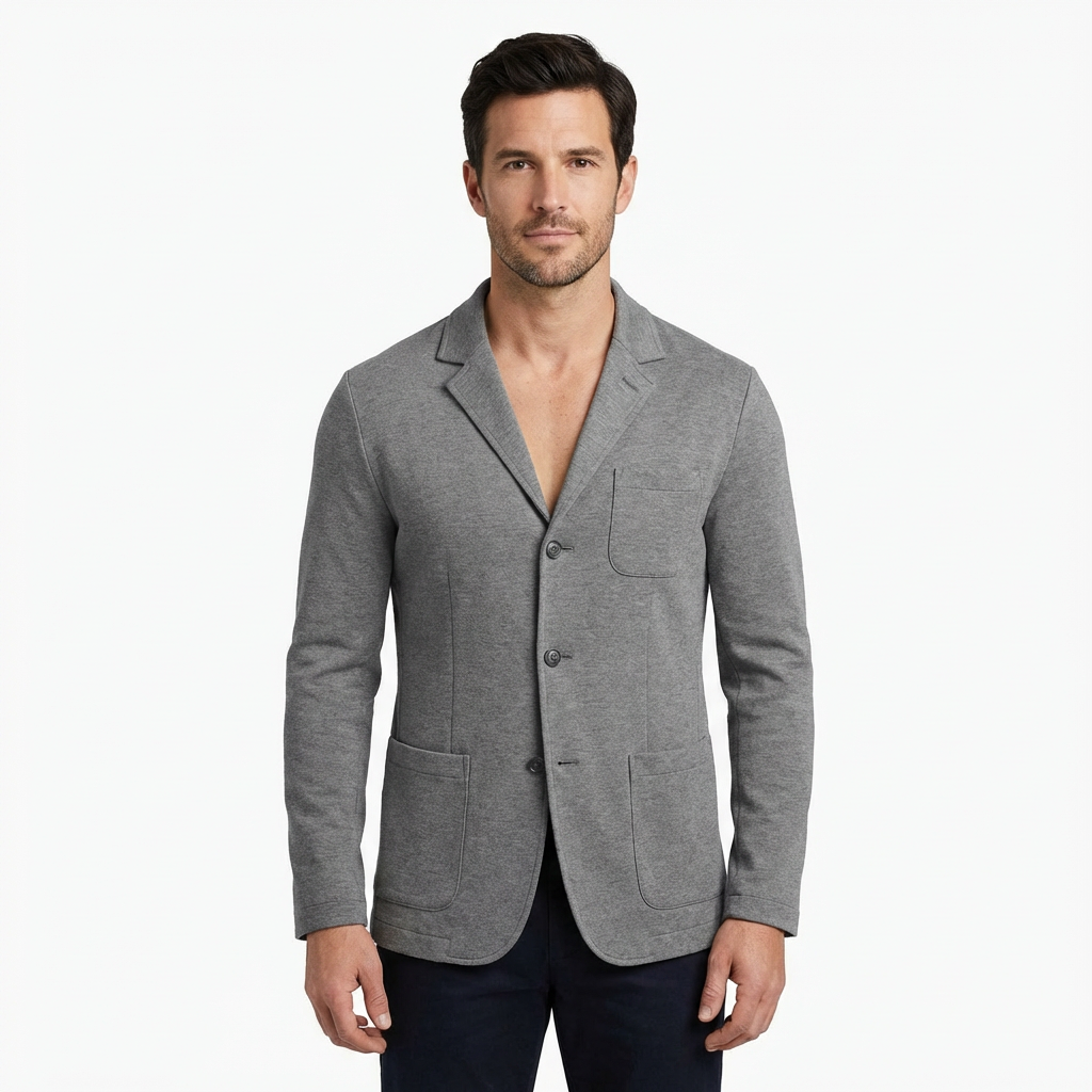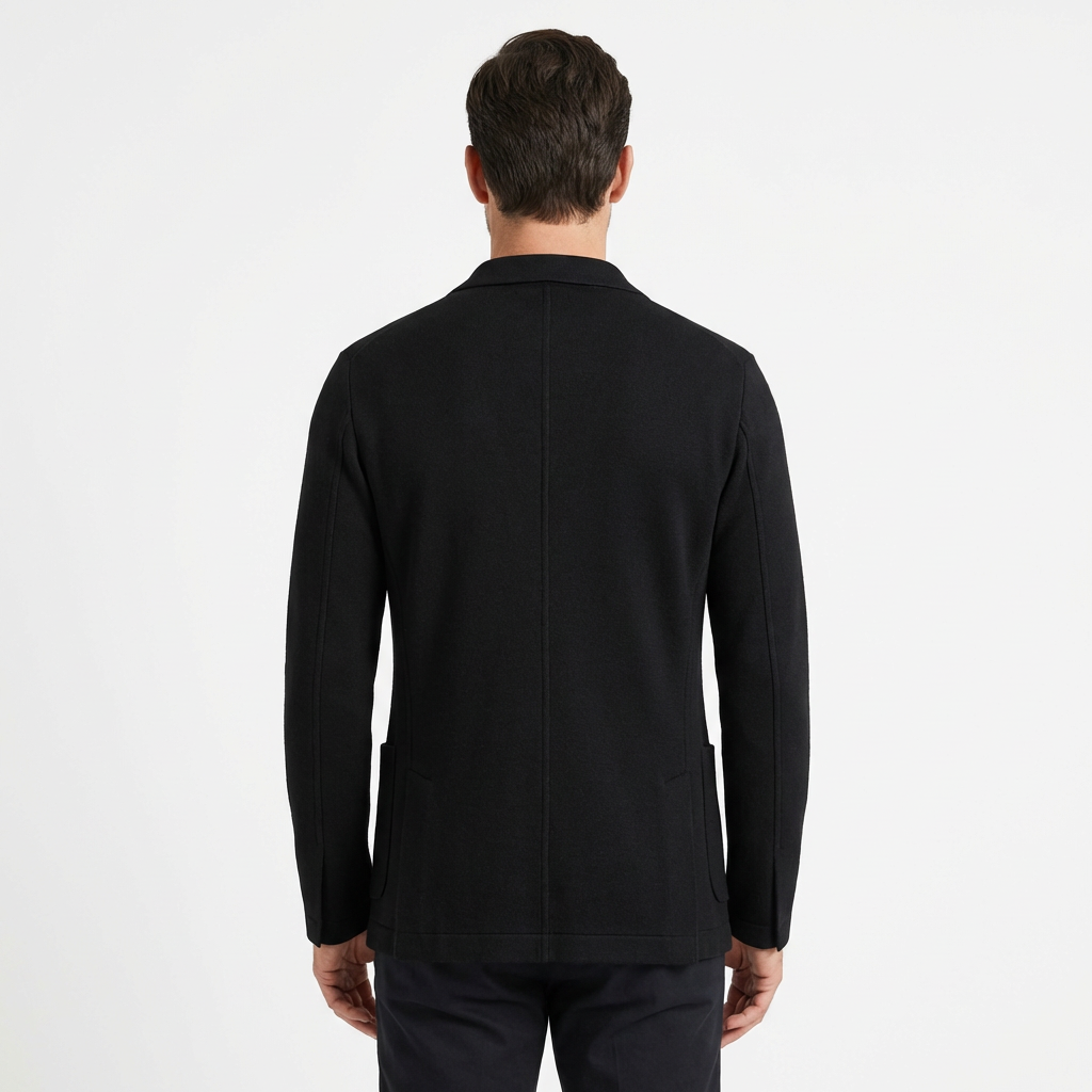 This tailored cardigan features a sharp, blazer-inspired outline with a smooth, composed finish. The silhouette frames the shoulders cleanly while falling naturally through the body. Its surface feels soft yet substantial, creating a sense of quiet confidence. Designed to hold its shape while allowing ease of movement.