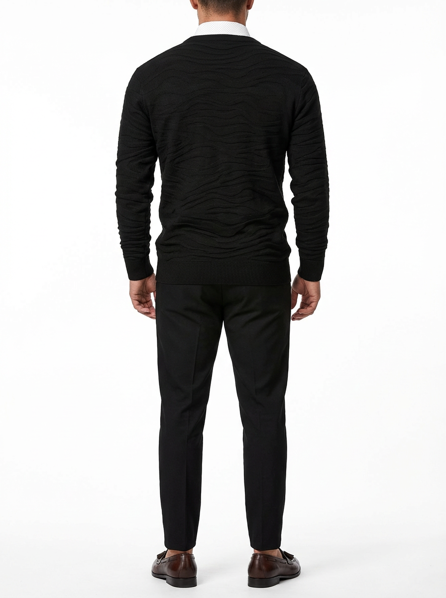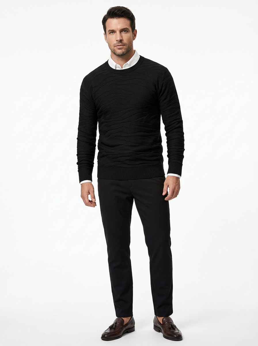 This crewneck sweater features a smooth, wave-like textured pattern that gives the silhouette depth without overwhelming the clean shape. The fit is streamlined and balanced, sitting close to the body while maintaining a naturally relaxed feel. Ribbed edges at the collar, cuffs, and hem provide subtle structure that frames the sweater with precision. The surface appears soft and fluid, delivering a confident yet understated presence.