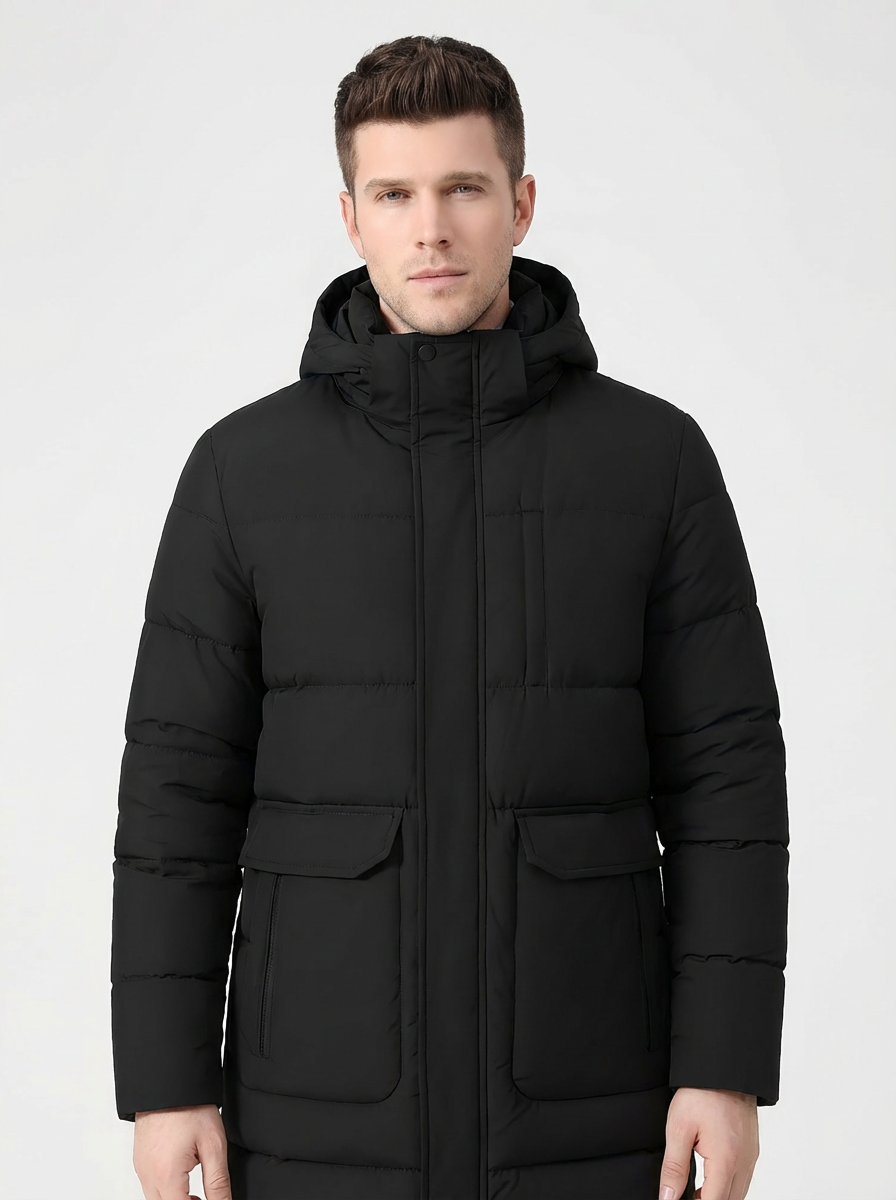 This long hooded coat presents a clean, structured silhouette that falls just above the knee. Broad quilting lines and smooth padding create a refined, powerful look from every angle. The high neck and deep hood cocoon the upper body with a calm, protective feel. Hidden closures and neat pocket detailing keep the front sleek while maintaining an easy, relaxed wear.